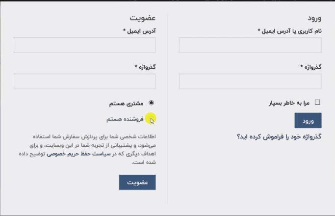 بیشتر قالب های فروشگاهی معتبر و محبوب که طرفداران زیادی هم دارند، در فروشگاه هایی که با این قالب ها طراحی میشوند با کلیک “دکمه عضویت” که معمولاً در قسمت هدر سایت قرار دارد، صفحه ثبت نام، نمایش داده میشود. در این صفحه دو فیلد “مشتری هستم” و “فروشنده هستم” وجود دارد. فروشنده ها برای عضویت در فروشگاه میبایست دکمه “فروشنده هستم” را انتخاب کنند. با تکمیل اطلاعات شخصی و همچنین نام و آدرس فروشگاه اقدام به عضویت در سایت کنند.